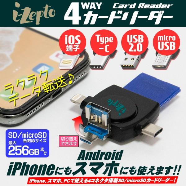 I Zepto Ios端子 Type C Usb Microusb Iphone スマホ データ転送 写真 動画 メール便発送 送料無料 En 4wayカードリーダー トクトクショッピング 通販 Paypayモール
