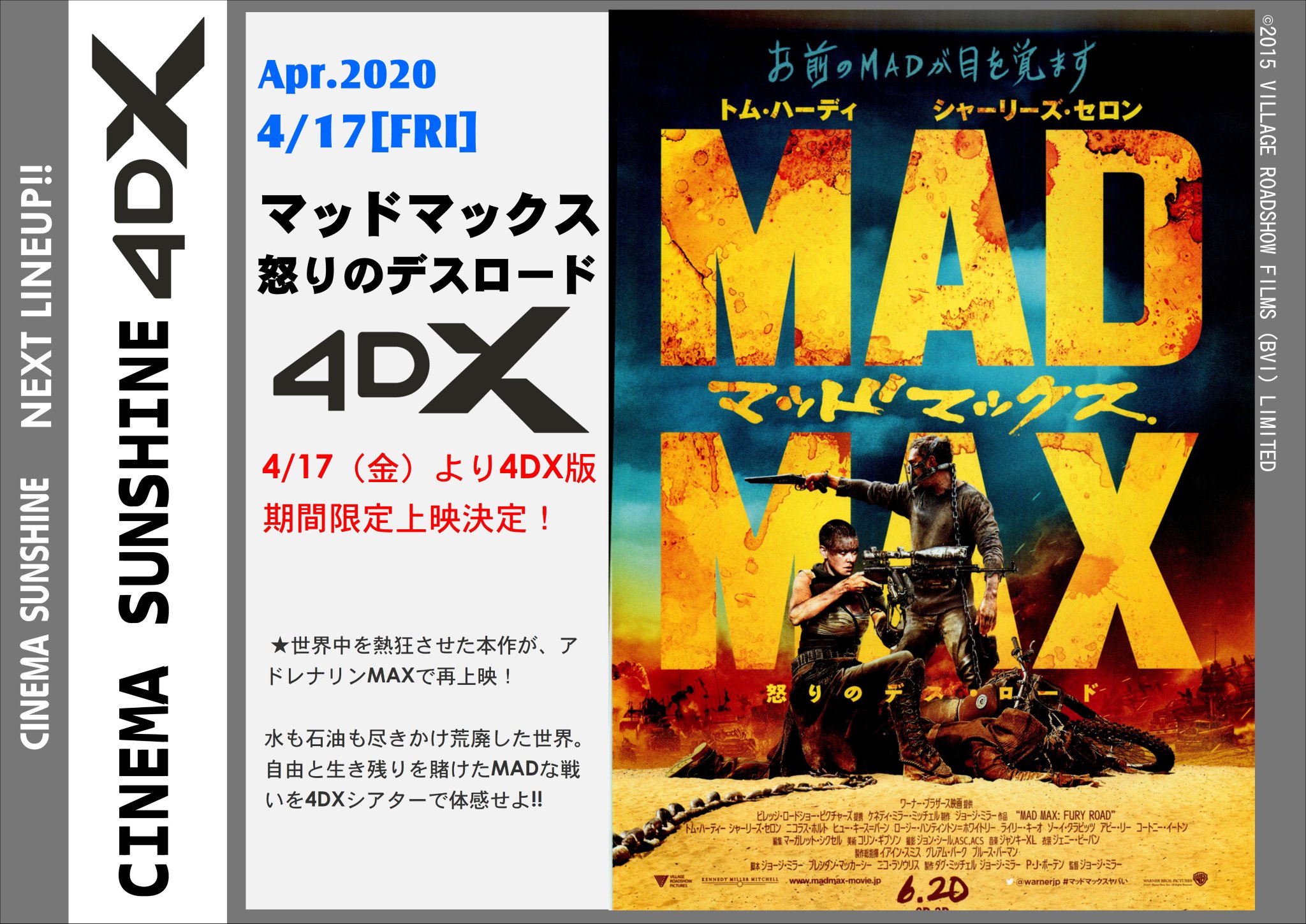 シネマサンシャイン 愛媛版 على تويتر Masakiより4dx 情報 4 17 金 マッドマックス 怒りのデス ロード 期間限定上映決定 R15 15歳未満の方は ご鑑賞出来ません 荒廃した近未来を舞台に 妻子を暴走族に殺された男の 壮絶な復讐を描く