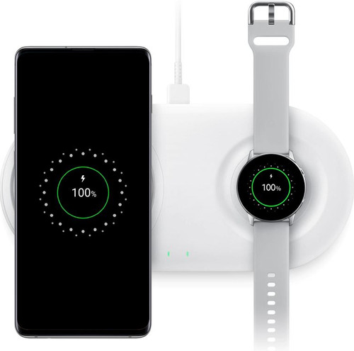Wireless Charger Duo Pad In White Shown Charging The Galaxy S10 Plus In Prism White And Galaxy Watch Active In Light G Samsung Wearable Device Wireless Charger